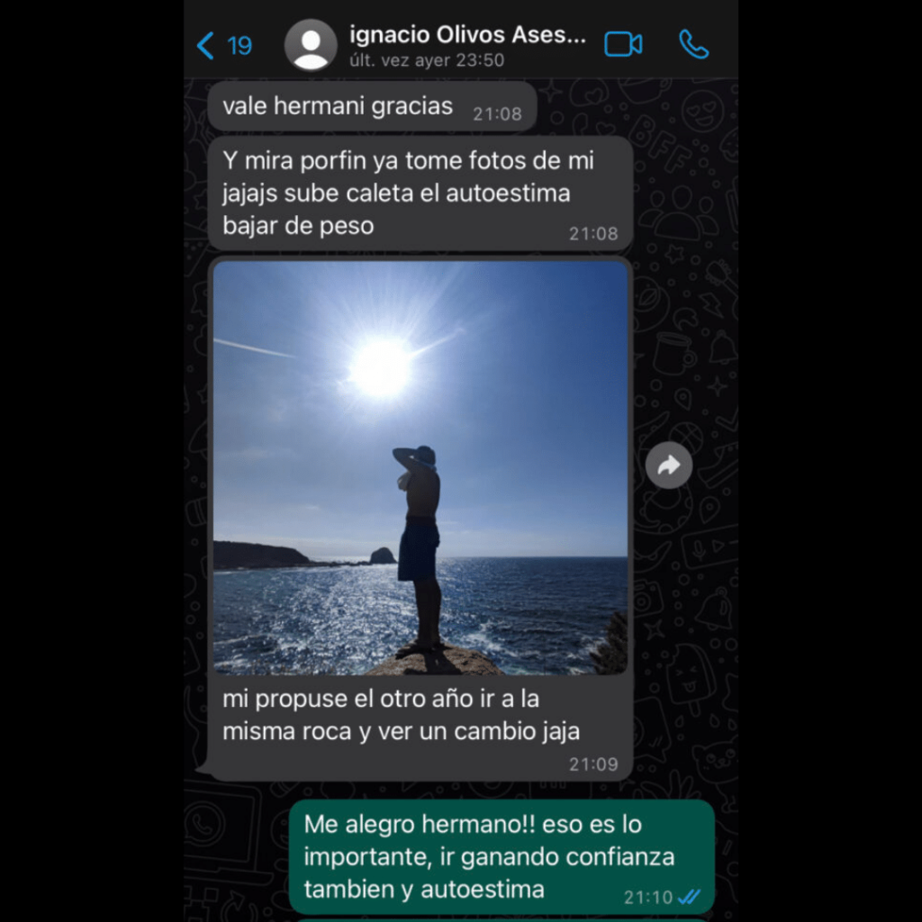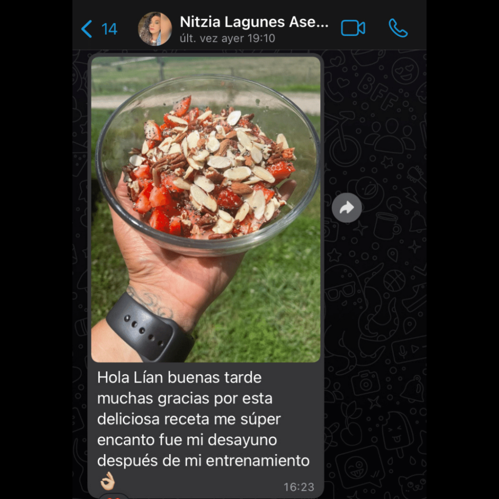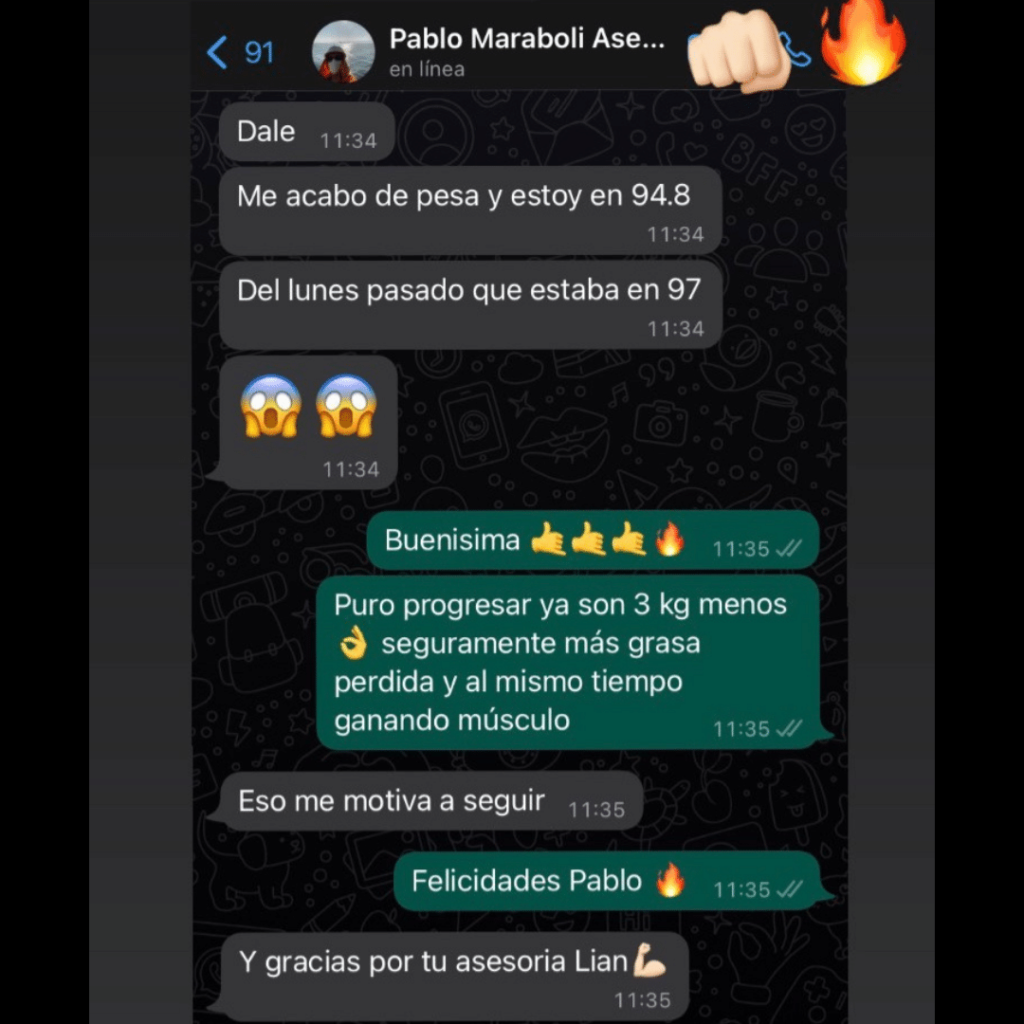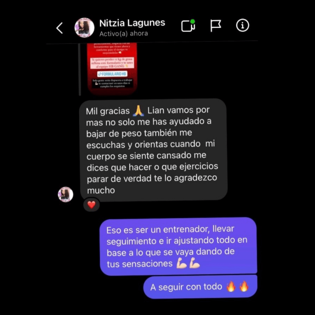 «Desde el dÃa 1 Lian te enseña a mejorar tu alimentación y entrenamiento con un plan personalizado, además se esfuerza en tener una comunicación constante. He crecido mucho en estos 5 meses, son resultados inesperados pero brutales, me he sentido muy bien.«