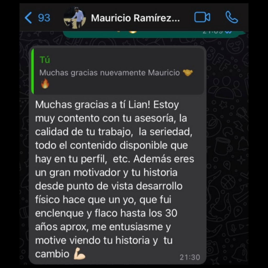 «Desde el día 1 Lian te enseña a mejorar tu alimentación y entrenamiento con un plan personalizado, además se esfuerza en tener una comunicación constante. He crecido mucho en estos 5 meses, son resultados inesperados pero brutales, me he sentido muy bien.«